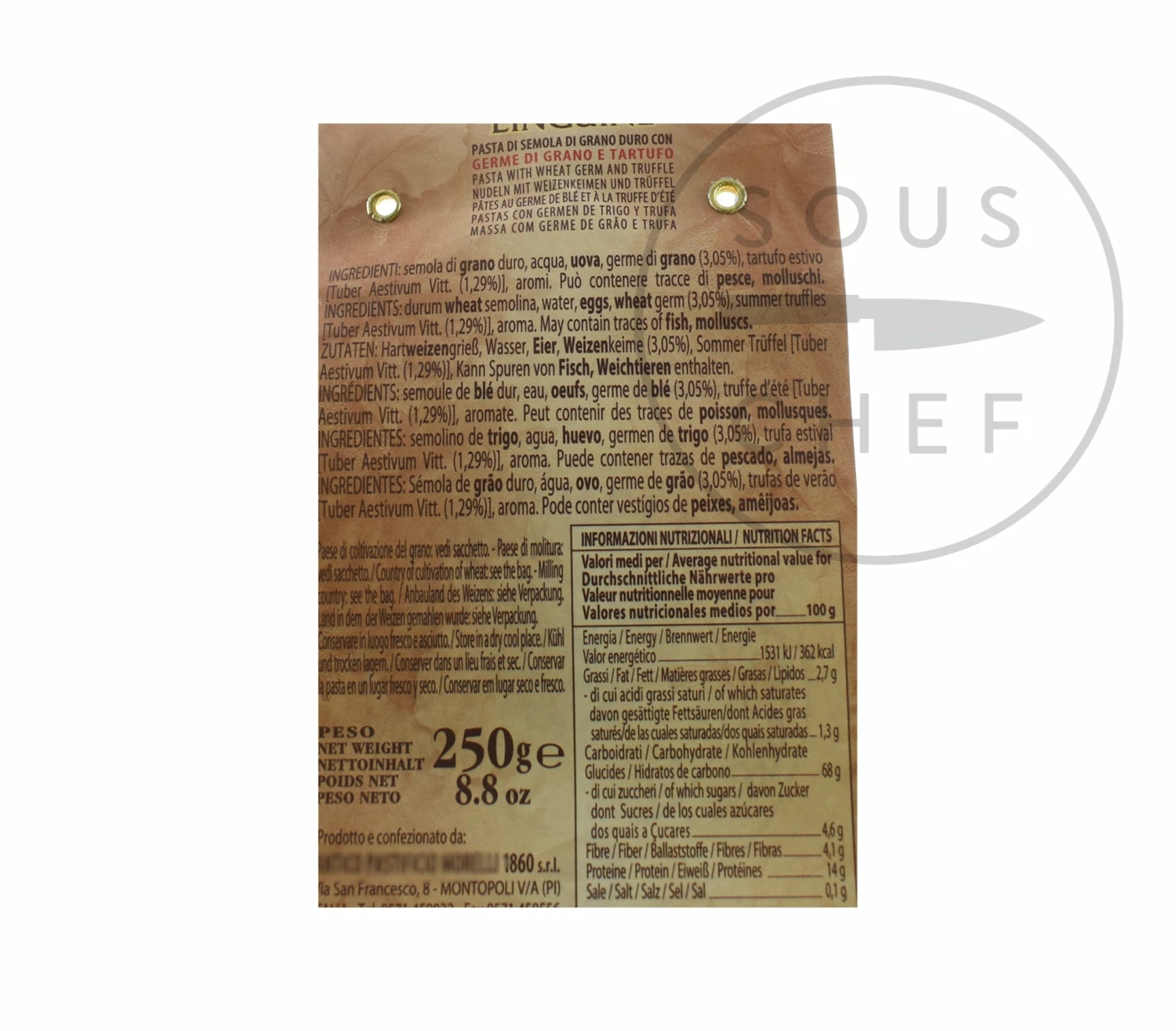 Ingredients: Durum wheat semolina, water, eggs, wheat germ (3.05%), summer truffles (Tuber Aestivum Vitt. (1.29%)), aroma.