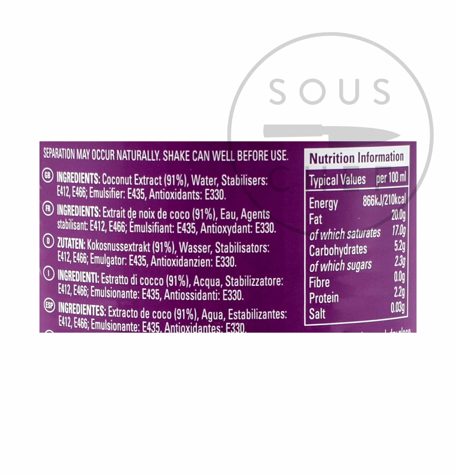 Ingredients: Coconut extract 91%, water, stabilisers E466, E412, emulsifier: E435, Antioxidants: E330.