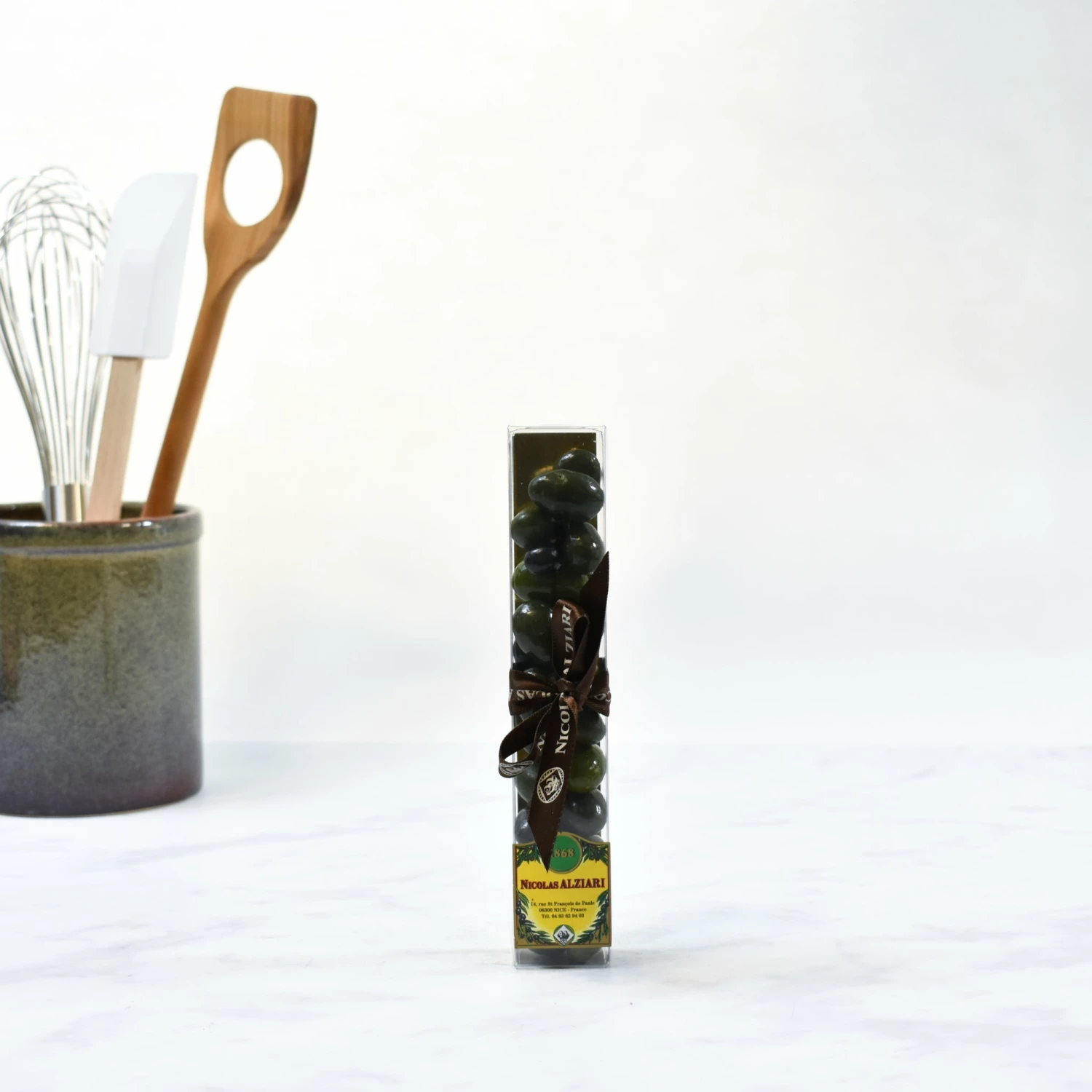 Provence olive-shaped chocolates are a quirky take on plain chocolate-coated almonds. The chocolate coating is cleverly painted to resemble black and green olives!