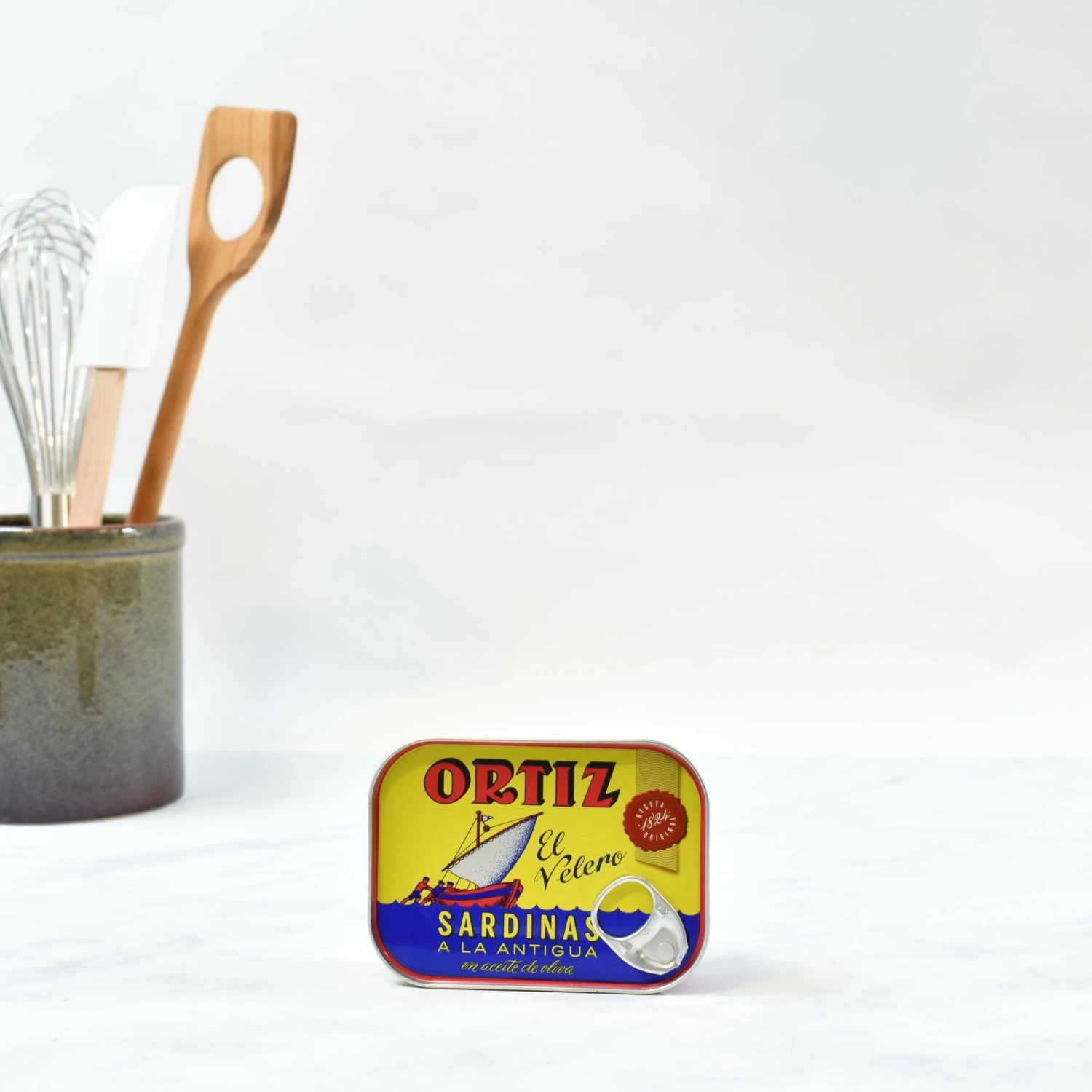 Enjoy sardines a la antigua in olive oil straight from the tin. Ortiz pick the freshest sardines from auctions on the north coast of Spain, then carefully clean and prepare them by hand. The sardines are quickly fried in virgin olive oil, before being tinned with olive oil and a little salt. Try lightly toasting slices of fresh, crusty bread, top with crushed tomatoes and garlic, and finally place a single sardine on top. Enjoy as a starter or snack.