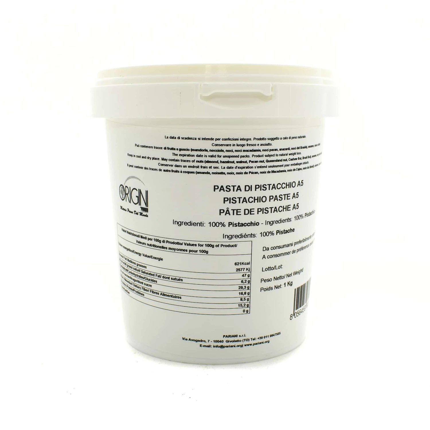 Pariani’s A5 grade pistachio paste is a high quality alternative to those made with Sicilian or Bronte pistachios, and is one of their most popular non-Italian pistachio pastes. It is made with a lower percentage of peeled and raw pistachios, and still has excellent flavour.