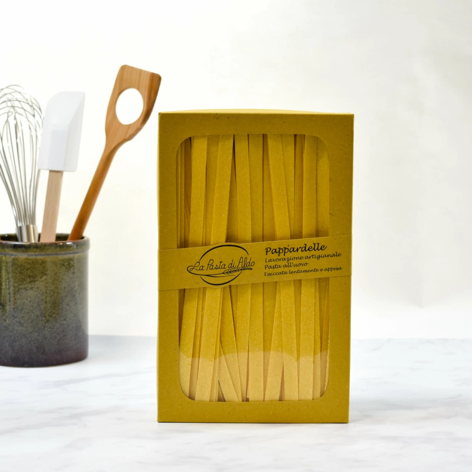 Pasta di Aldo pappardelle egg pasta has a rich and refined flavour – this is one pasta you won’t want to smother with sauce! Serve the wide ribbons simply with a little butter or high quality olive oil and black pepper, to let the flavour of the pasta shine through.