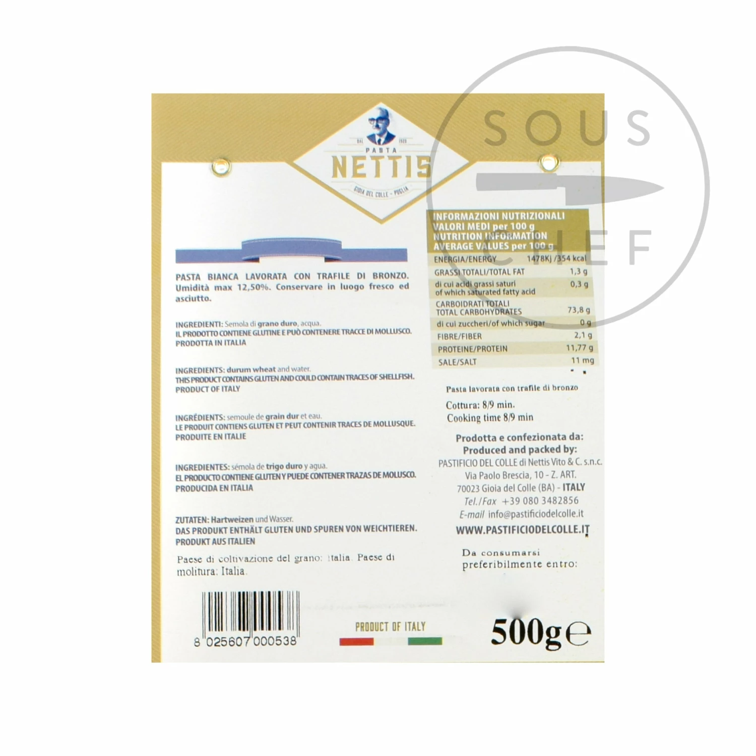 Pastificio Del Colle’s Nettis bronze die riccia mafaldine pasta has a lovely ruffled finish, designed to collect as much sauce as possible. Extruded on a bronze die, the pasta also has a slightly rough texture – for an even better sauce coating.
