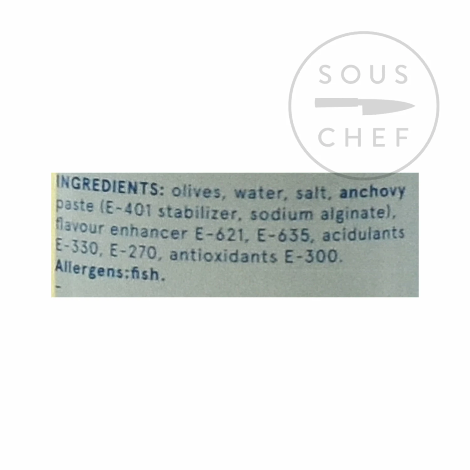 Ingredients: olives, water, salt, anchovy paste (E-401 stabilizer, sodium alginate), flavour enhancer E621, E635, acidulants E330, E270, antioxidant E300. Contains allergens: fish.
