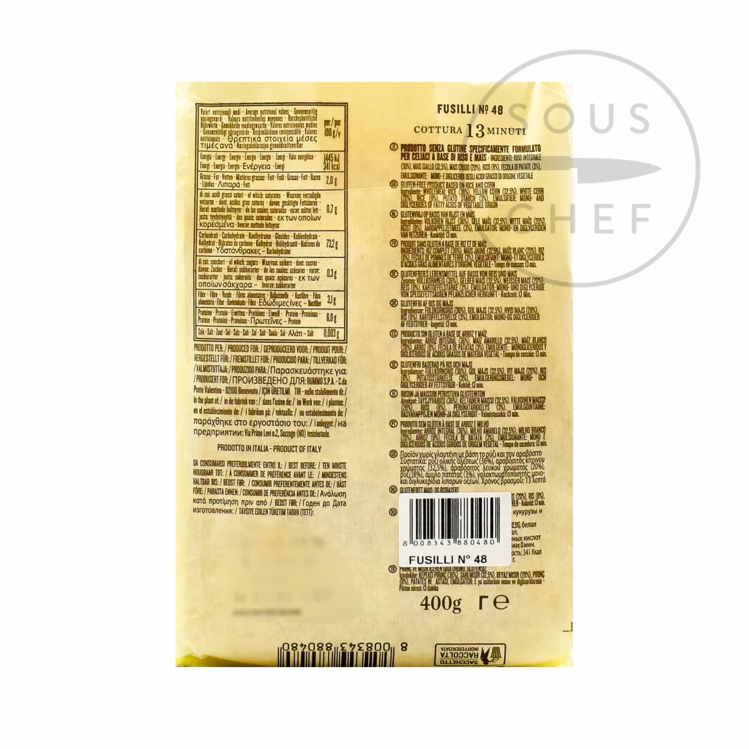 Rummo fusilli pasta no. 48 is one of the classic pasta shapes, now gluten-free. It is made with rice and GMO-free corn. The pasta shapes are drawn through a bronze die, to give the pasta a texture that your sauce will cling to. Rummo gluten-free fusilli pasta cooks in 11 minutes.
