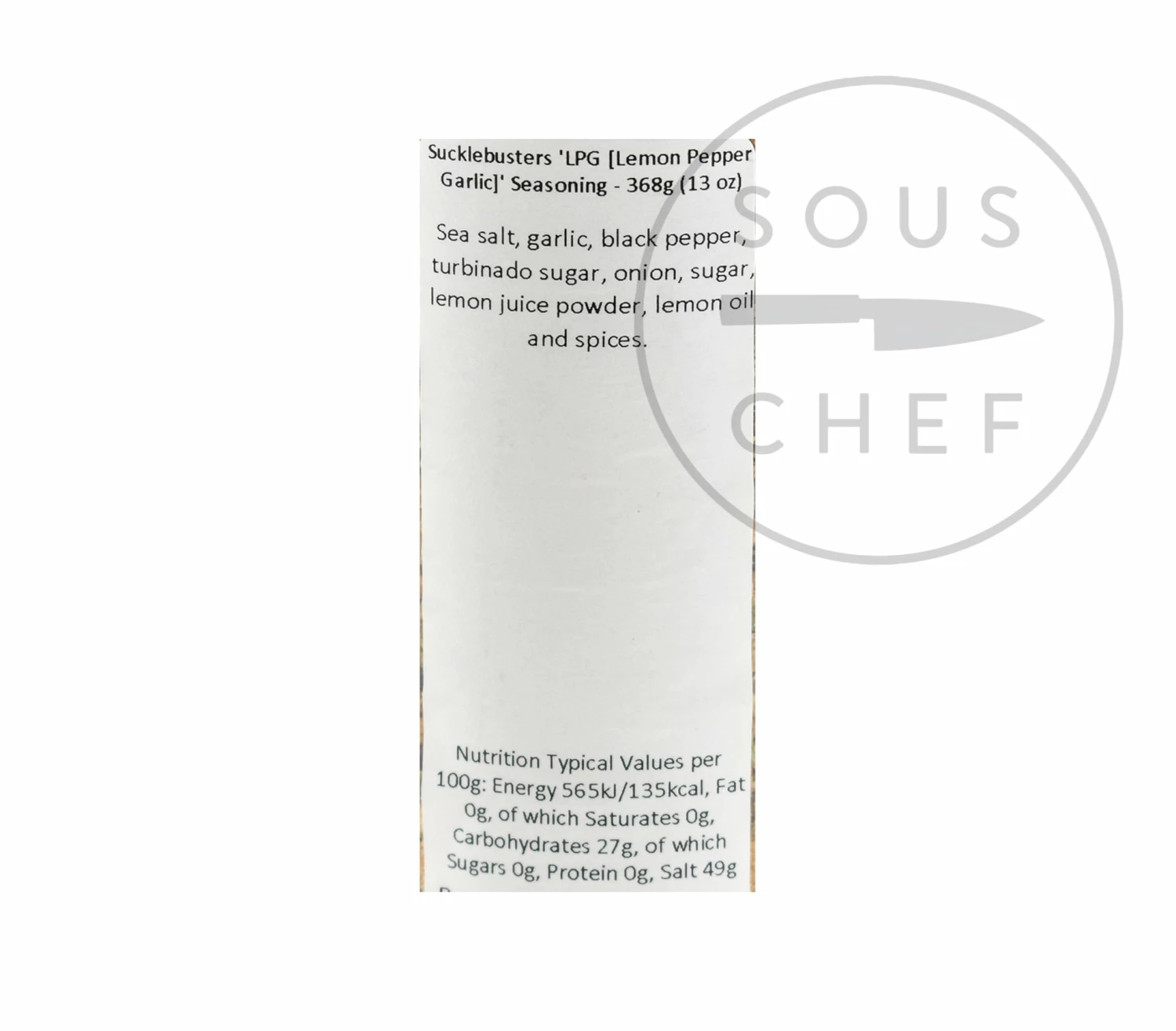 Ingredients: Sea salt, garlic, black pepper, turbinado sugar, onion, sugar, lemon juice powder, lemon oil and spices.
