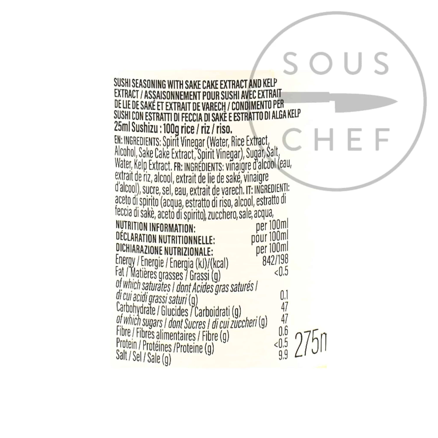 275ml Ingredients: spirit vinegar (water, rice extract, alcohol, sake cake extract, spirit vinegar), sugar, salt water, kelp extract.