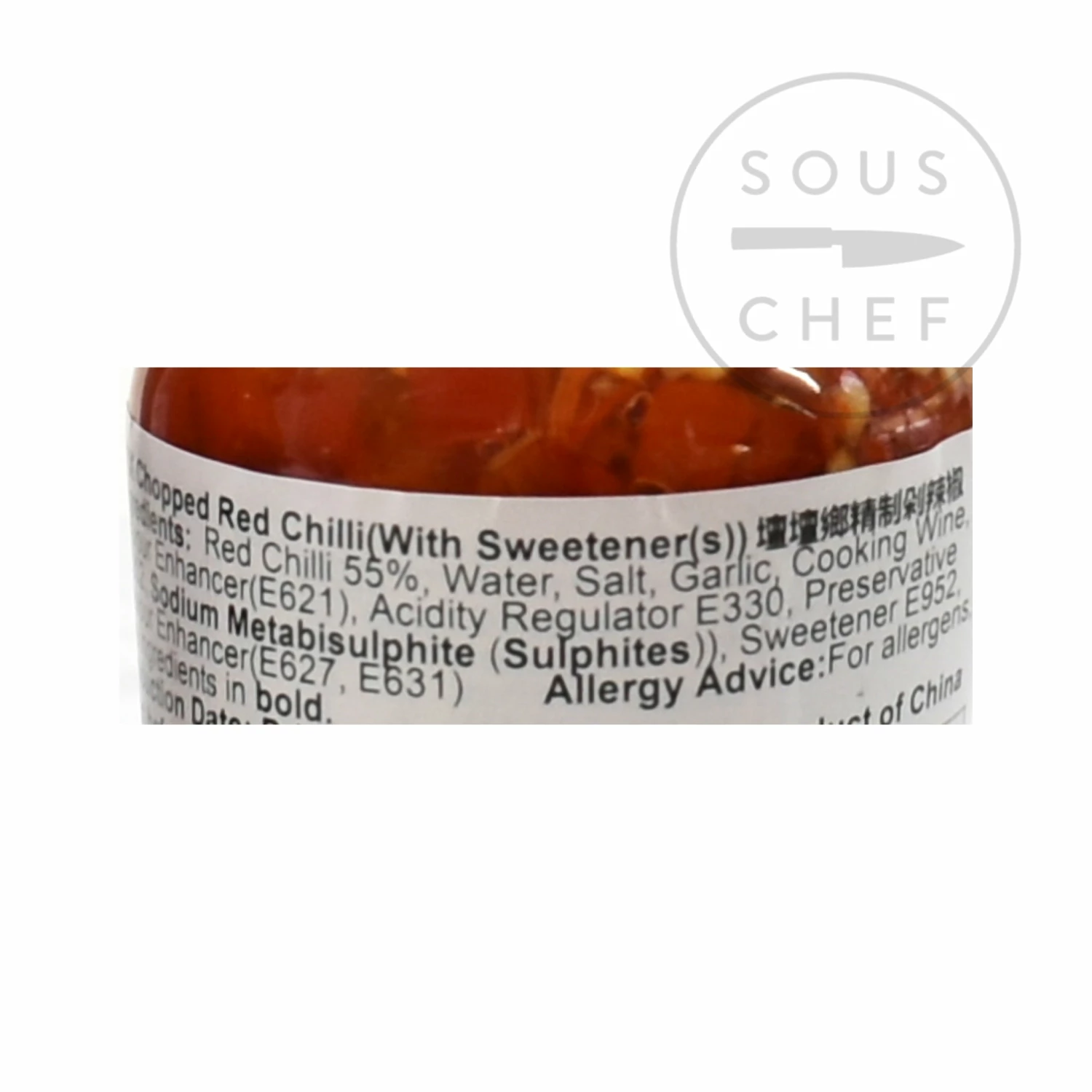 Ingredients: Red chilli 55%, water, salt, garlic, cooking wine, flavour enhancer (E621, E627, E631), preservative (E202, E223), sweetener E952, acidity regulator E330. Contains sodium metabisulphite
