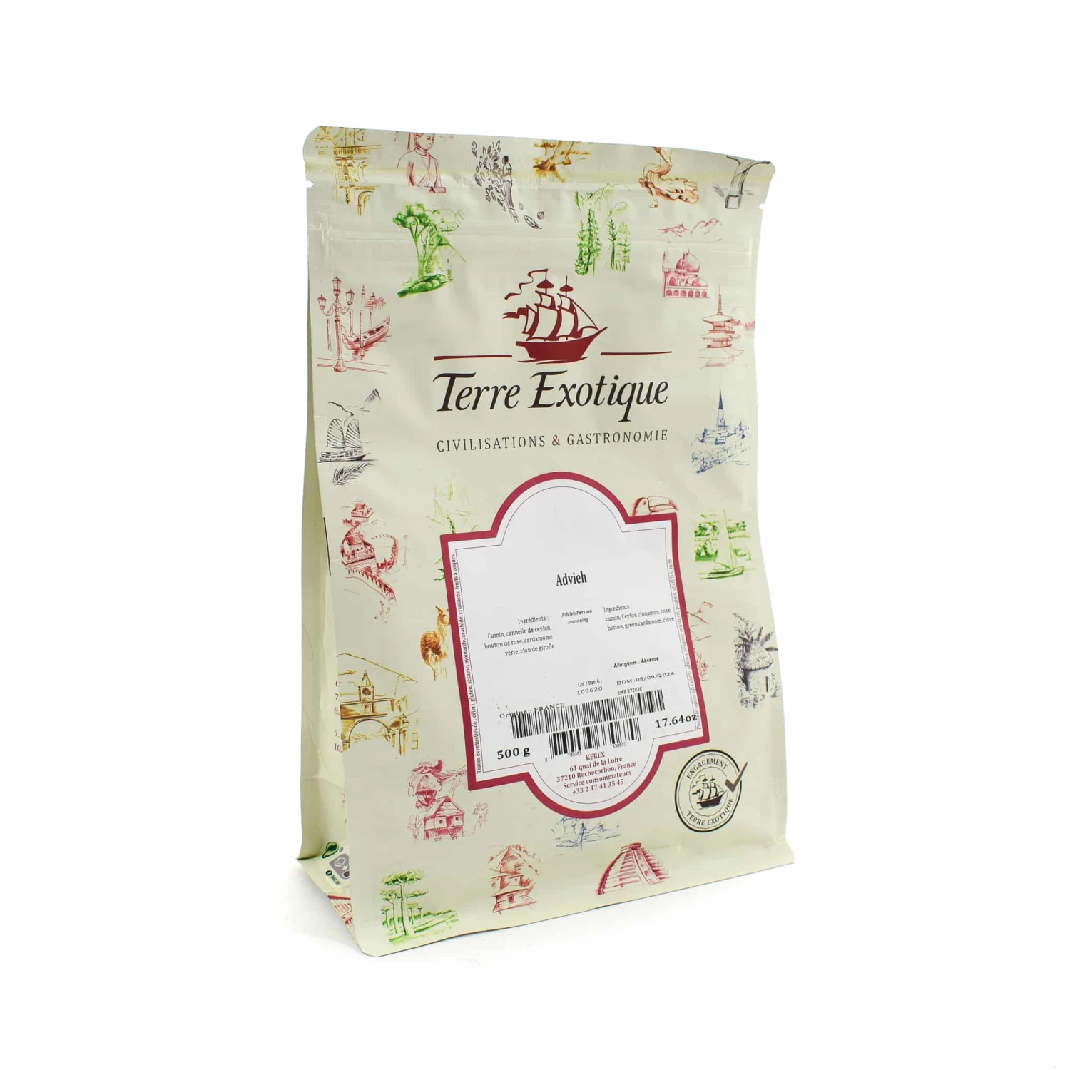 Terre Exotique’s advieh Persian seasoning is a fragrant mix of cumin, Ceylon cinnamon, rose buds, green cardamom and cloves, perfect for adding fragrance to savoury dishes. Advieh is wonderful for seasoning rice dishes and chicken stews, or using as a dry rub for lamb.
