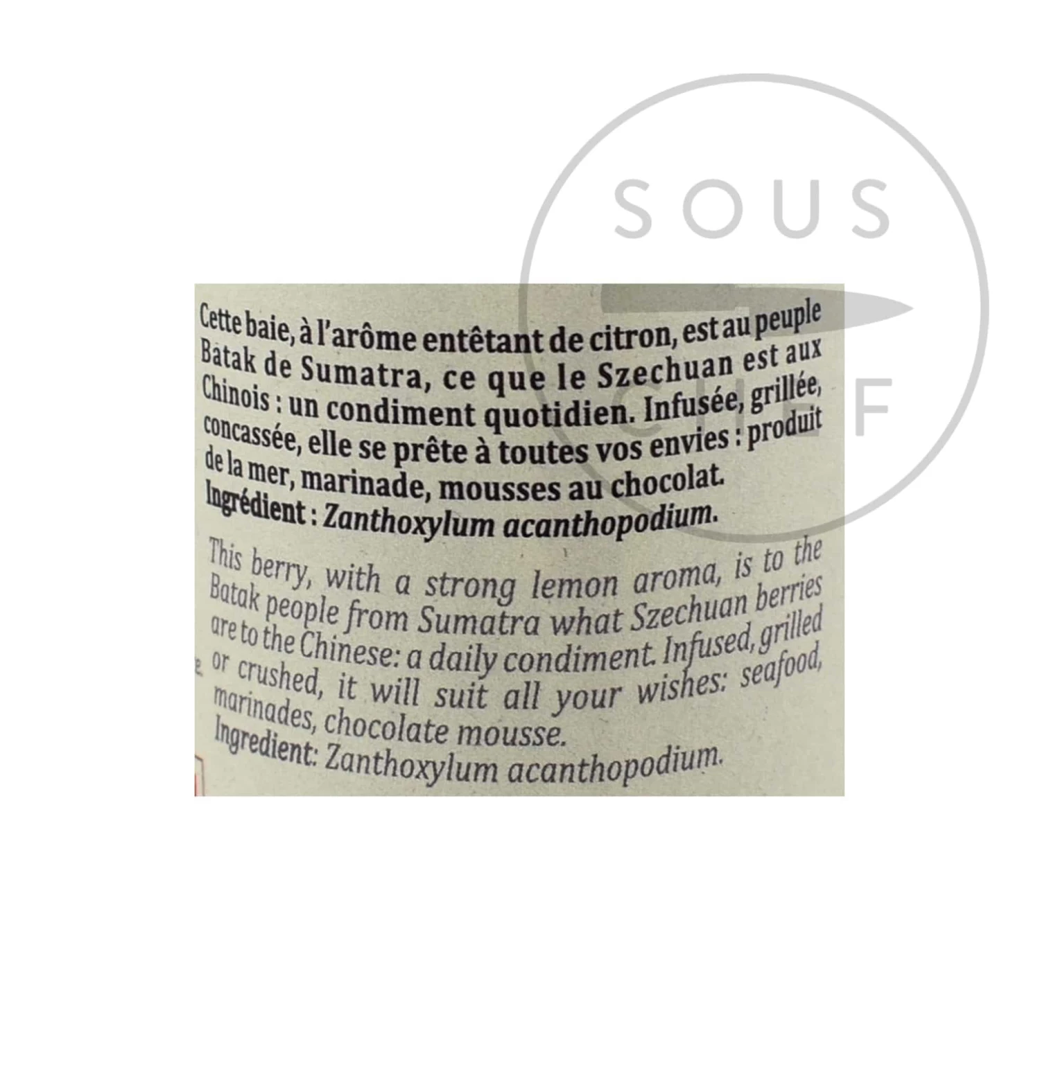 Terre Exotique’s Batak berry has heady lemon aromas – the Batak equivalent of Chinese Szechuan berry. Harvested in Indonesia by the Batak people, these berries grow in the zanthoxylum acanthopodium bush and are related to Szechuan berries. Also known as Bataks pepper, these berries are used in a traditional dish of Ikan mas arsik, made with wok-fried carps and a ginger & lemongrass sauce.