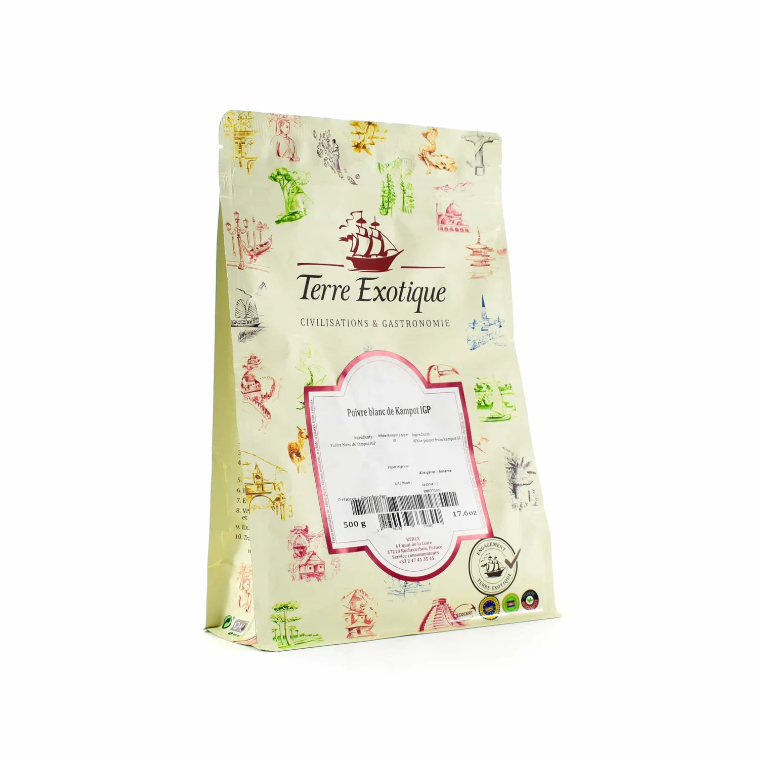 This 500g bag is ideal for catering and professional kitchens – the white Kampot pepper comes in opaque packaging, protecting it from light and preserving the fresh flavour, while the flat base makes it easy to store.