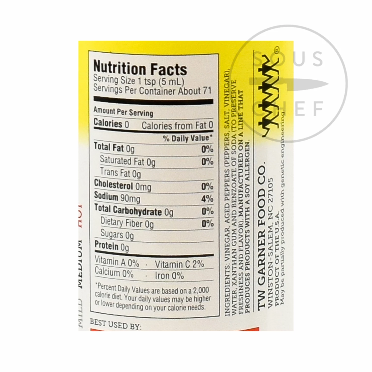 Ingredients: vinegar, aged peppers, (peppers, salt, vinegar), water, xanthan gum and benzoate of soda. Manufactured on a line that produces products with soy allergens.
