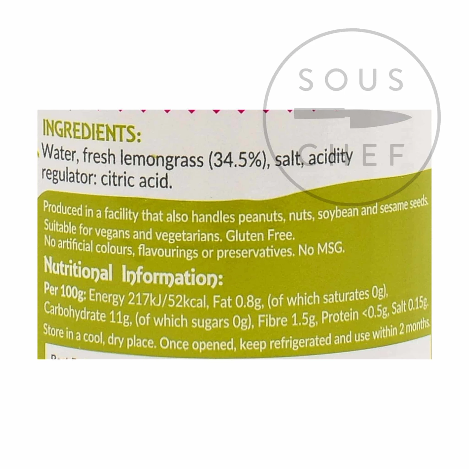 Ingredients: water, fresh lemongrass (34.5%), salt, acidity regulator: citric acid.