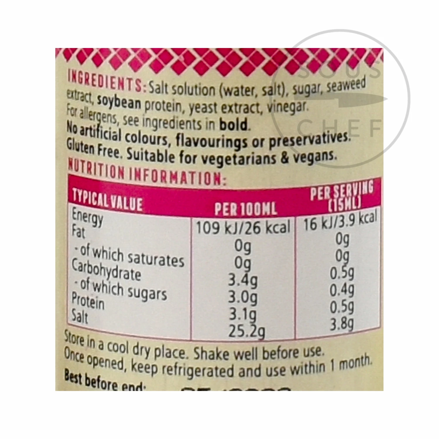 Ingredients: salt solution (water, salt), sugar, seaweed extract, soybean protein, yeast extract, vinegar. Contains allergens: soy.