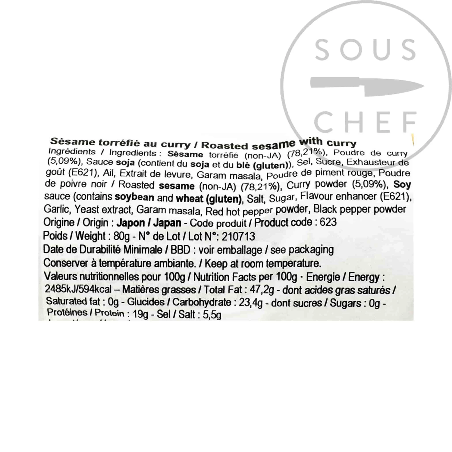 Ingredients: roasted sesame (non-JA) (78.21%), curry powder (5.09%), soy sauce (contains soybean and wheat (gluten), salt, sugar, flavour enhancer (E621), garlic, yeast extract, garam masala, red hot pepper powder, black pepper powder.Â