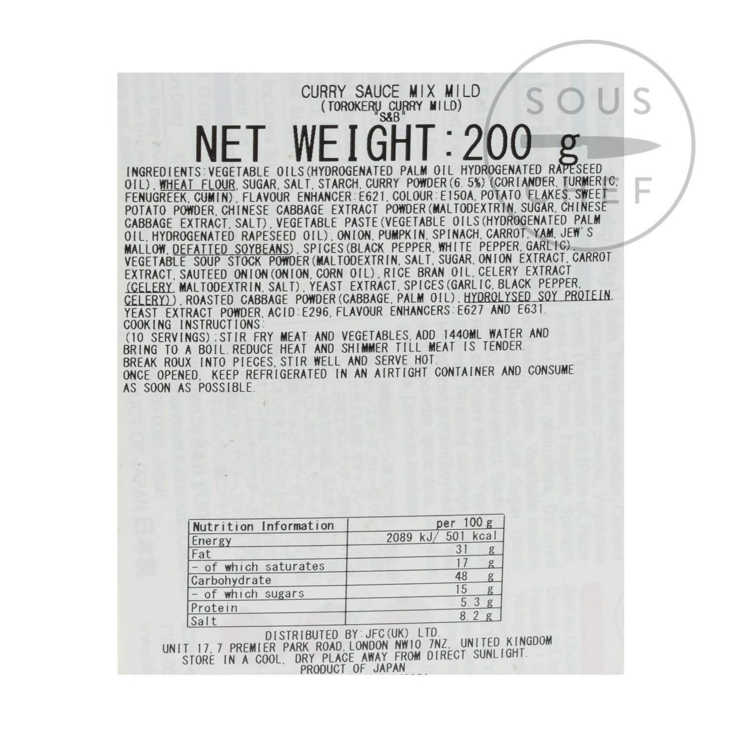 Ingredients: vegetable oils (hydrogenated palm oil, hydrogenated rapeseed oil), wheat flour, sugar, salt, starch, curry powder 6.5% (coriander, turmeric, fenugreek, cumin), flavour enhancer: E621, colour: E150A, potato flakes, sweet potato powder, Chinese cabbage extract powder (maltodextrin, sugar, Chinese cabbage extract, salt), vegetable paste (vegetable oils (hydrogenated palm oil, hydrogenated rapeseed oil), onion, pumpkin, spinach, carrot, yam, jew’s mallow, defatted soybeans), spices (black pepper, white pepper, garlic), vegetable soup stock powder (maltodextrin, salt, sugar, onion extract, carrot extract, sauteed onion (onion, corn oil), rice bran oil, celery extract (celery, maltodextrin, salt), yeast extract, spices (garlic, black pepper, celery), roasted cabbage powder (cabbage, palm oil), hydrolysed soy protein, yeast extract powder, acid E296, flavour enhancers: E627, E631. Allergens are listed in bold.