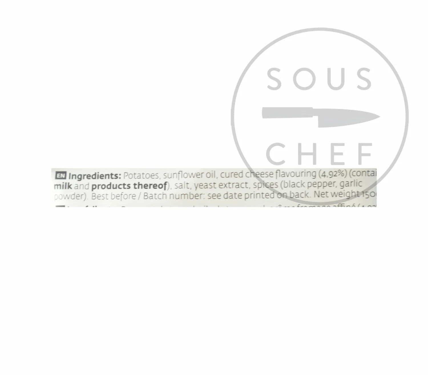 Ingredients: Potatoes, sunflower oil, cured cheese flavouring (4.92%) (contains milk and products thereof), salt, yeast extract, spices (black pepper, garlic powder)