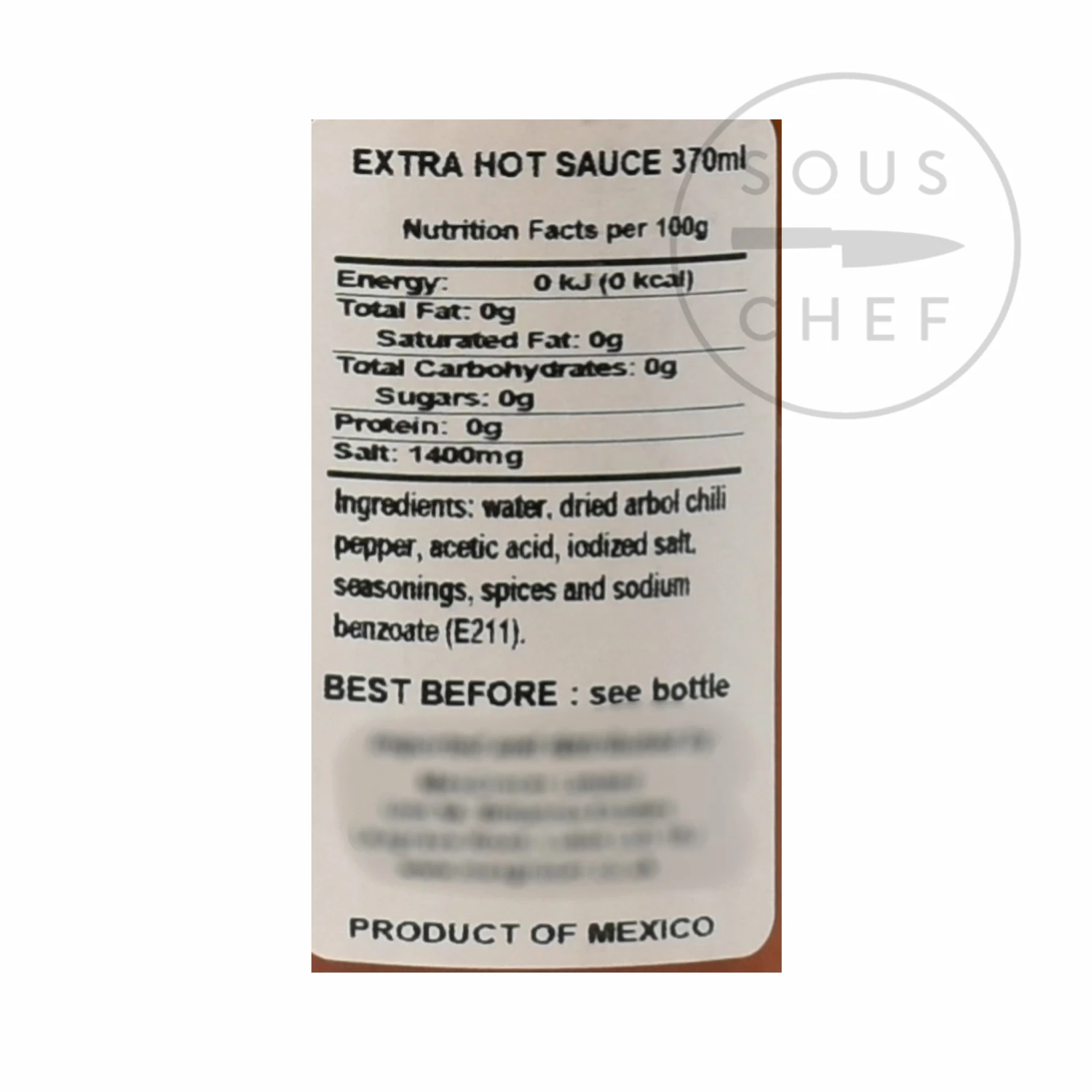 Ingredients: water, dry arbol chillies, acetic acid, iodised salt, flavourings, spices, sodium benzate (0.1%)