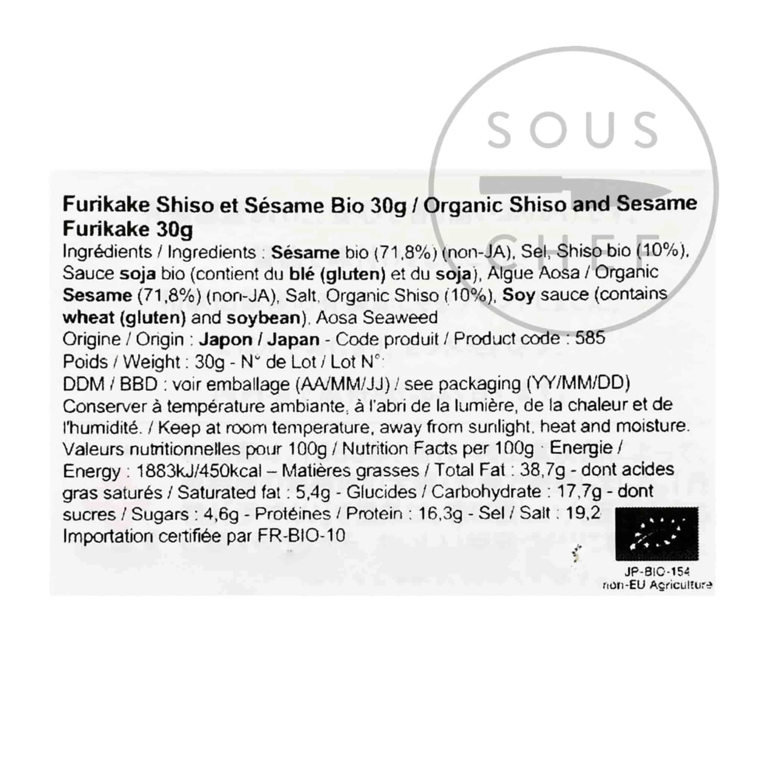 Ingredients: organic sesame (71.8%) (non-JA), salt, organic shiso (10%), soy sauce (contains wheat (gluten) and soybean). Aosa seaweed.Â