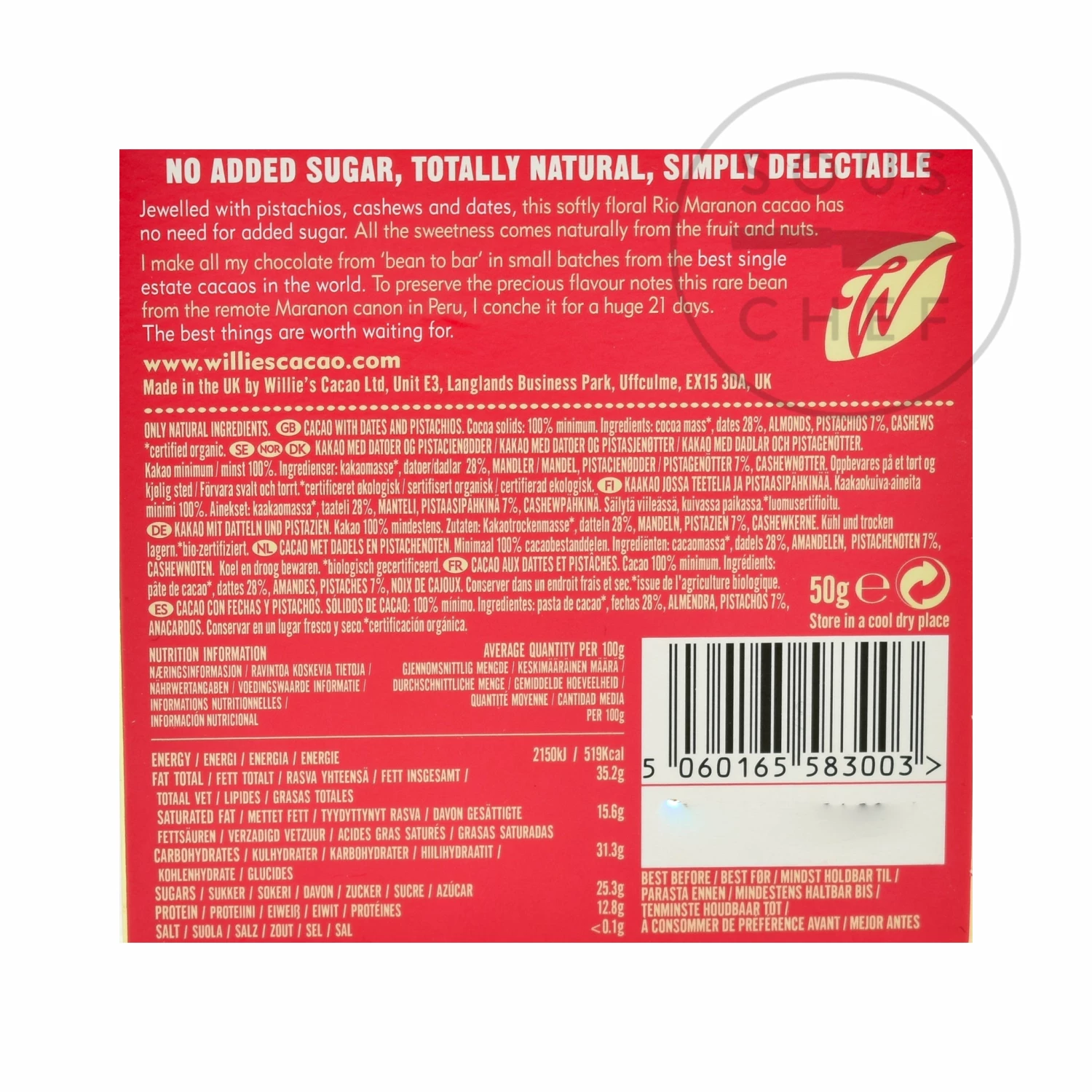 Ingredients: Cocoa solids 100% minimum. Ingredients: cocoa mass*, dates 27%, almonds, pistachios 7%, cashews. *Certified organic. Allergens listed in bold.