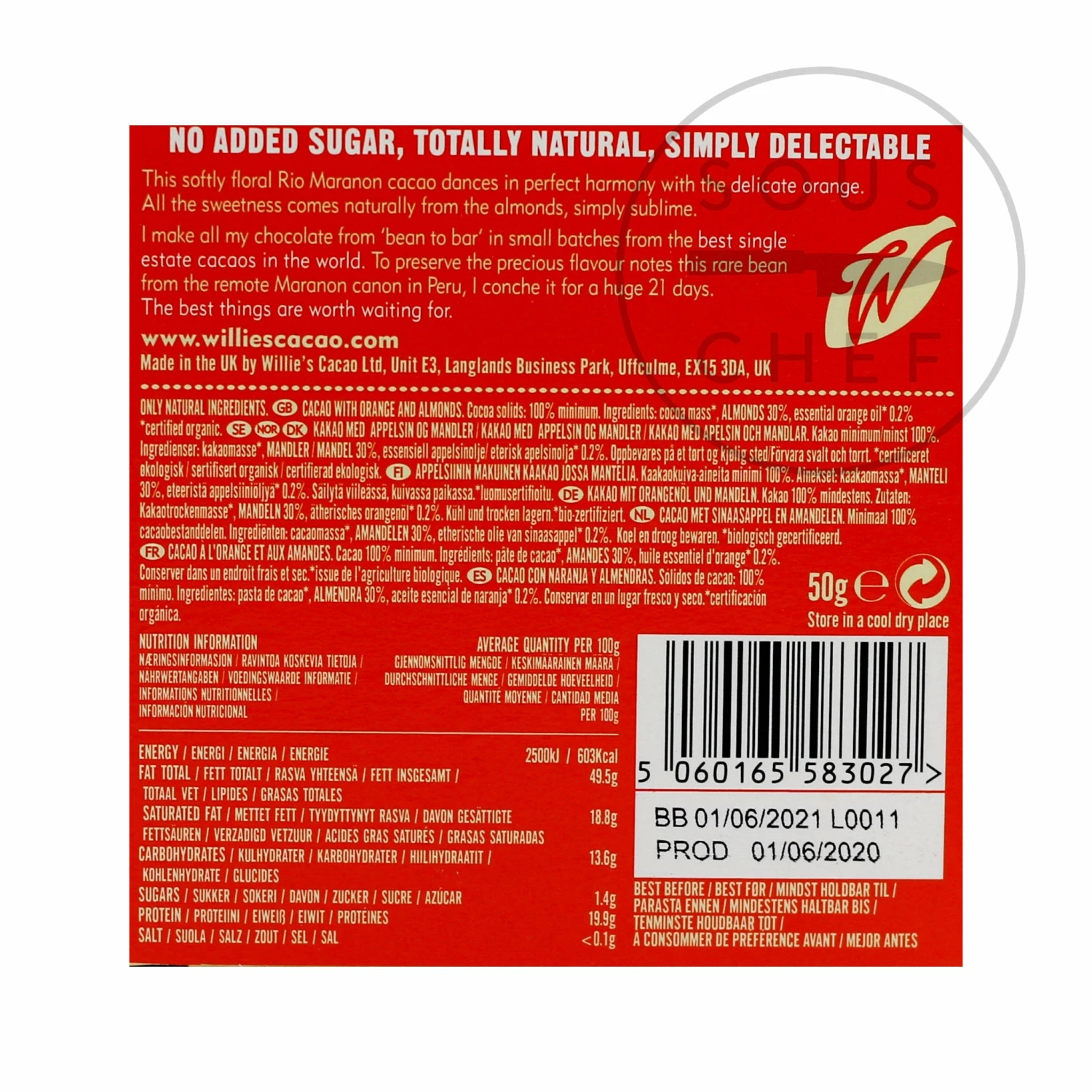 Willie’s Cacao orange & almond 100% dark chocolate is vegan and completely natural. The softly floral cocoa (sourced from Rio Maranon) balances against delicate orange essence. No sugar is added – instead, sweetness comes from almonds. This Willie’s bar is for those who are serious about chocolate. Enjoy it yourself, or gift it to a chocolate aficionado.