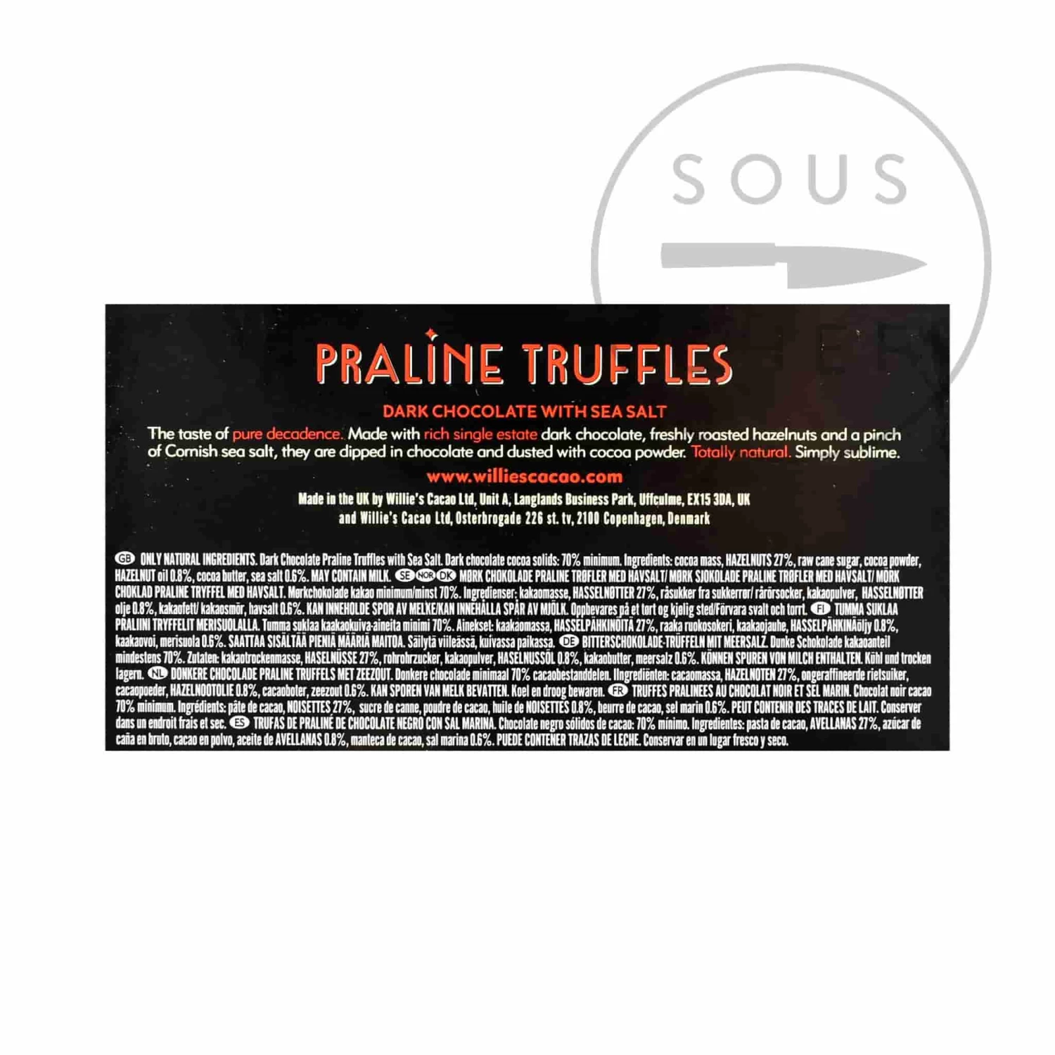 Willie’s Cacao dark chocolate praline truffles with sea salt are perfect for those who love their chocolate rich and intense. A luxurious blend of single estate dark chocolate, roasted hazelnuts and a pinch of Cornish sea salt, they are finished with a smooth coating of extra chocolate and dusting of lightly bitter cocoa.