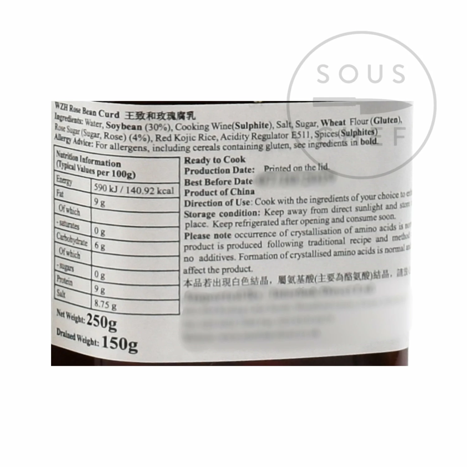 Ingredients: water, soybean (30%), cooking wine, salt, sugar, wheat (gluten) flour, sweetened rose (sugar, rose) (4%), red yeast, acidity regulator E511, spices (sulphites).