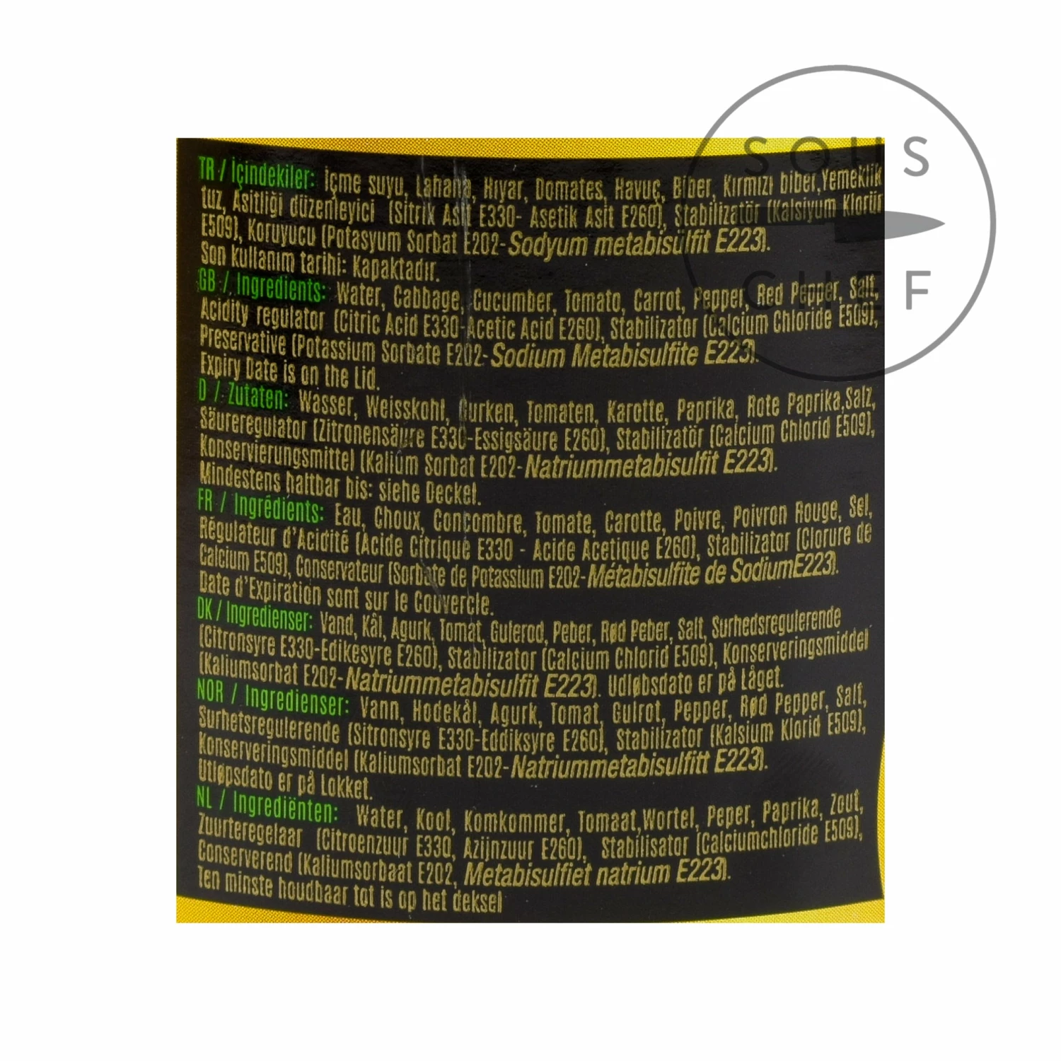 Ingredients: Water, cabbage, cucumber, tomato, carrot, pepper, red pepper, salt, acidity regulator (citric acid E330, acetic acid E260), stabilizer (calcium chloride E509), preservative (potassium sorbate E202, sodium metabisulfite E223).