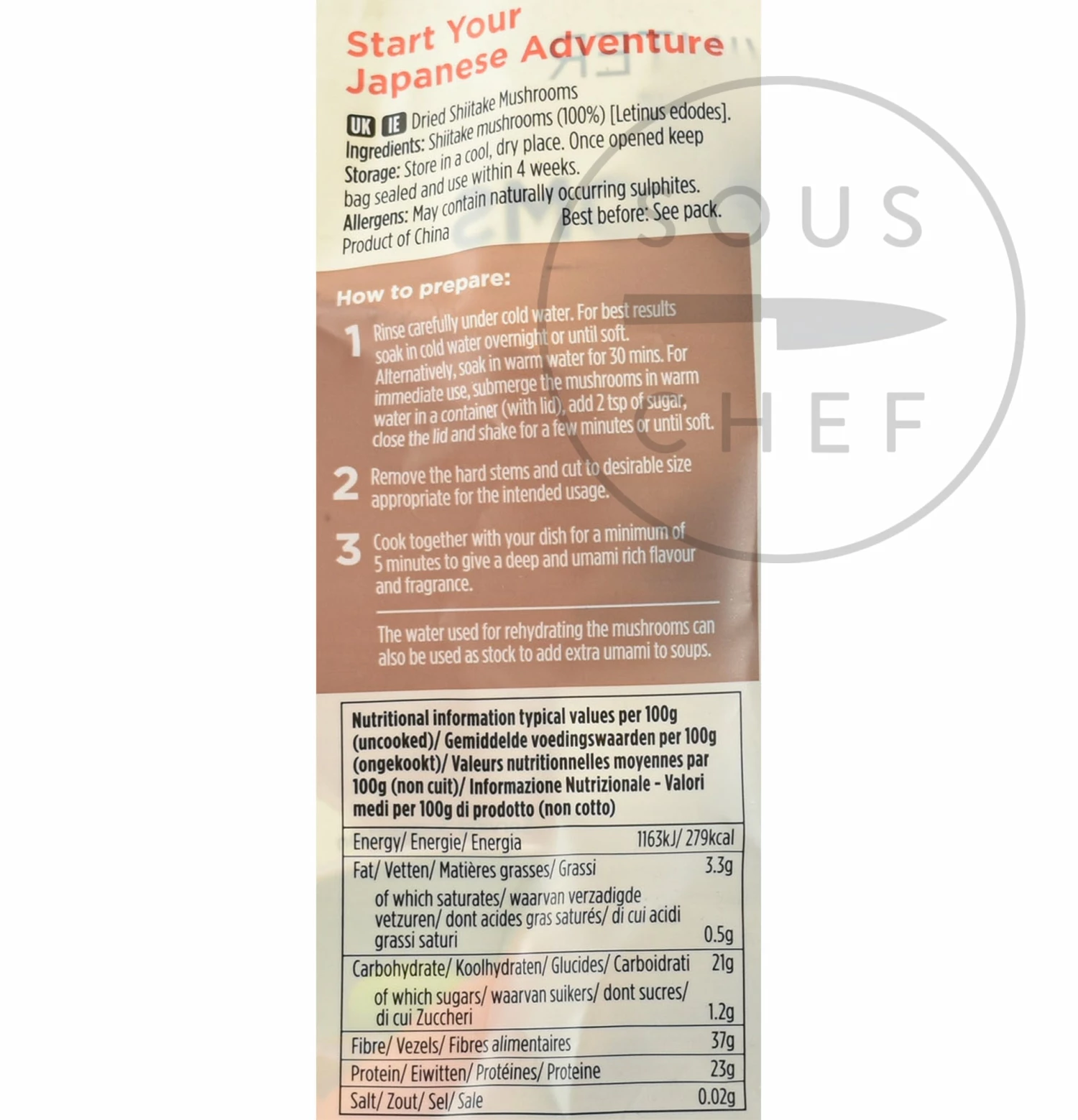 Ingredients: Dried Shiitake mushrooms (100%) (Letinus edodes). May contain naturally occurring sulphites.